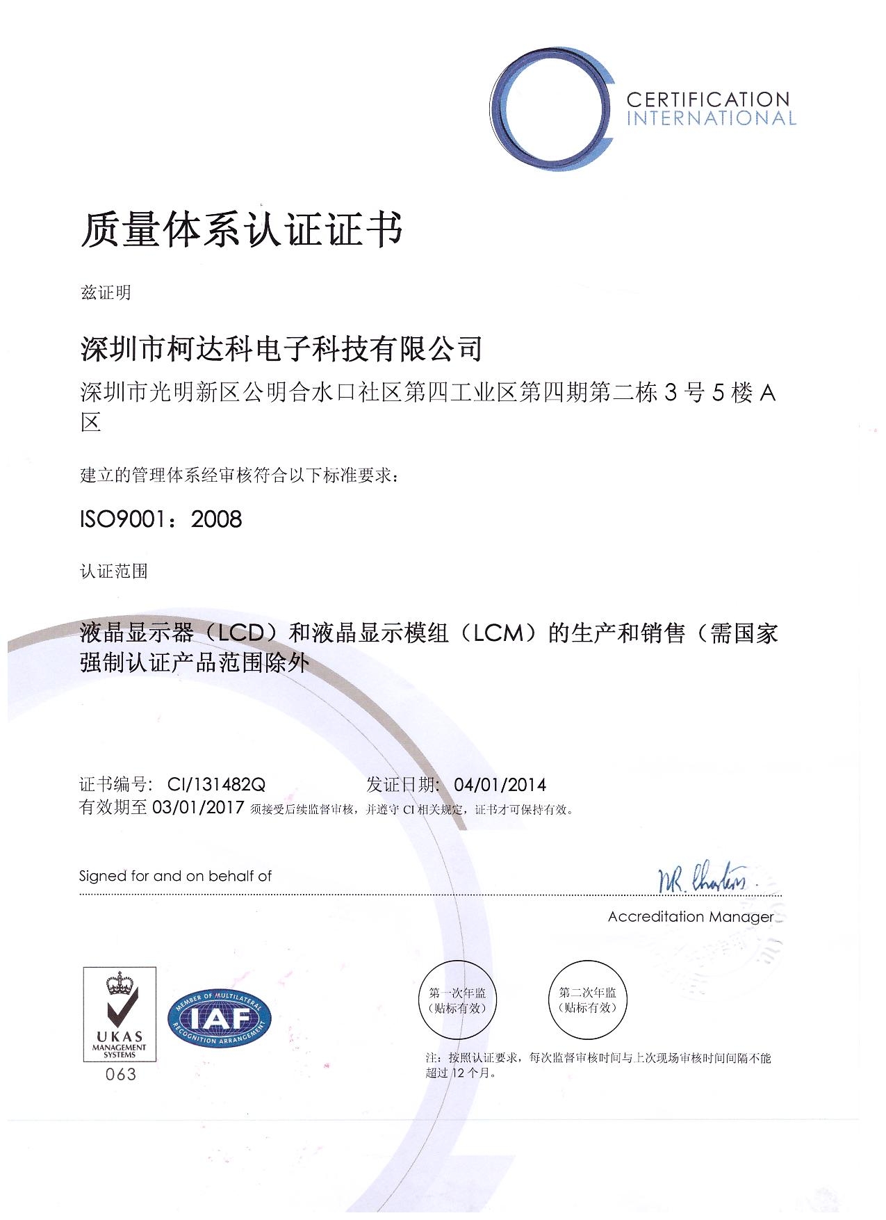 ISO9001:2008质量体系认证证书